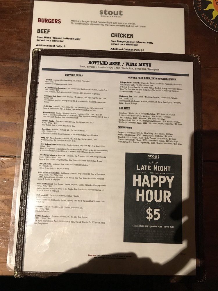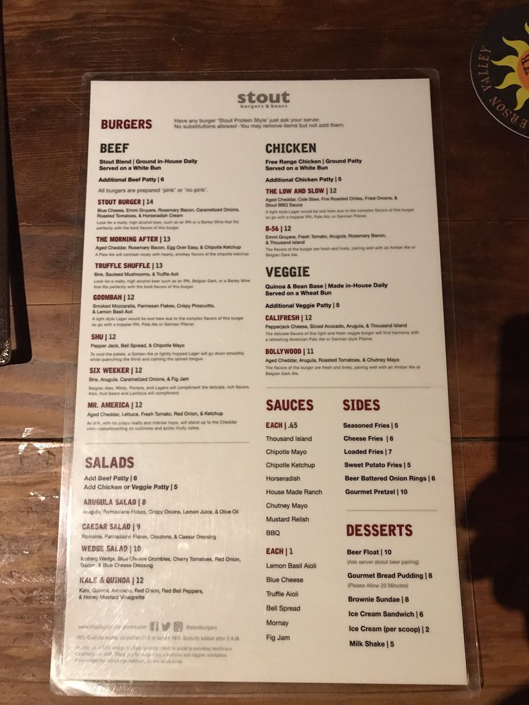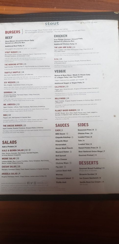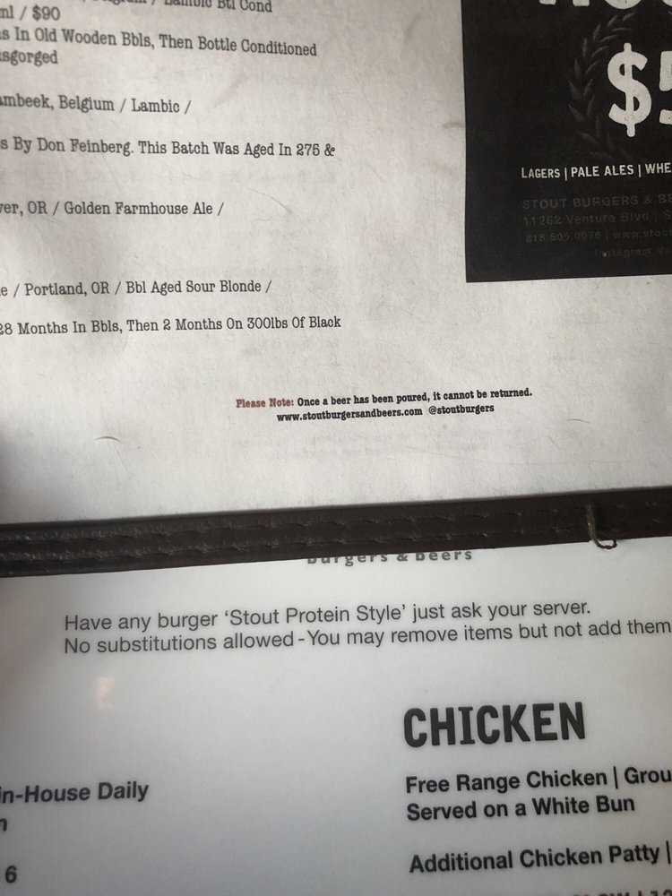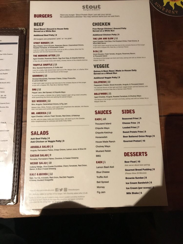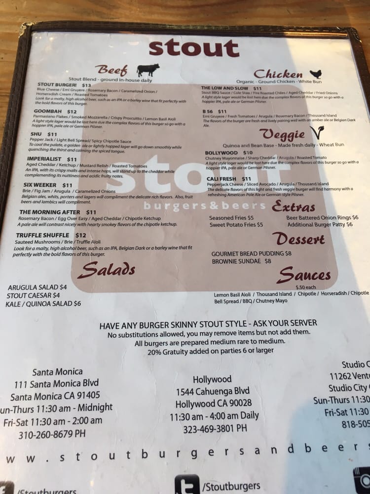Stout Burgers & Beers, located in Studio City, CA, offers a wide variety of gourmet burgers and beers in a cozy, dark-lit atmosphere. With options for chicken, beef, and veggie burgers, guests can enjoy unique creations like the Goombah with mozzarella, Parmesan flakes, and crispy prosciutto, or the Six Weeker with fig jam and caramelized onions. Customers rave about the quality of the meat and the flavorful toppings, like the fig jam in the Six Weeker. The service is friendly and attentive, and the ambiance is described as chill with sports playing on TV. Overall, Stout Burgers & Beers is a solid burger joint perfect for grabbing a few beers and enjoying delicious, high-quality burgers. So, if you're in the mood for a gourmet burger experience, make sure to check out this spot!